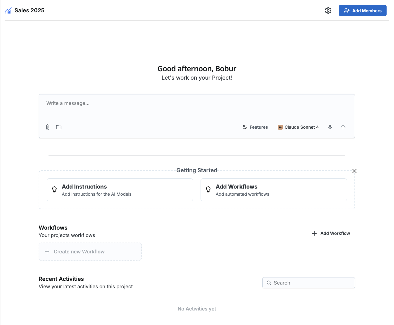 Füge deinem Projekt Workflows hinzu, um komplexe Aufgabenabfolgen zu automatisieren. Die Verwendung von Workflows an dieser Stelle stellt sicher, dass sie über den Projektkontext verfügen und ihre Chats in diesem Projekt gespeichert werden.